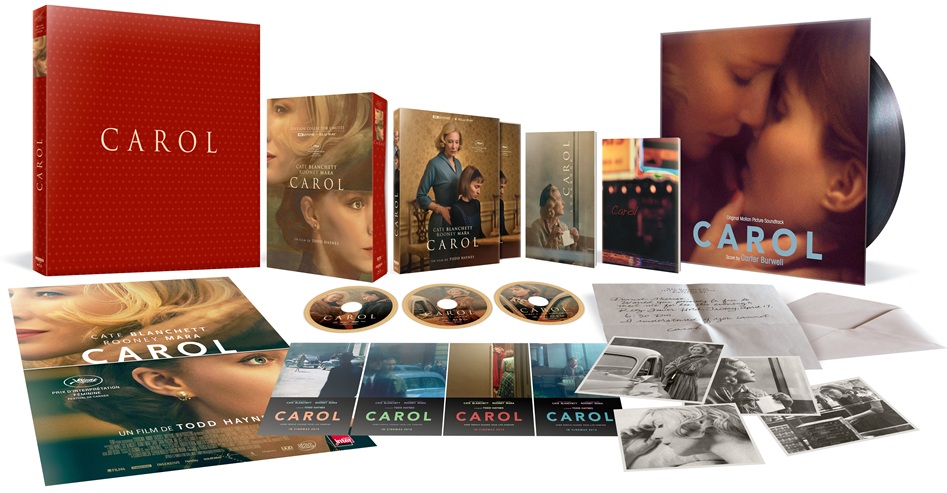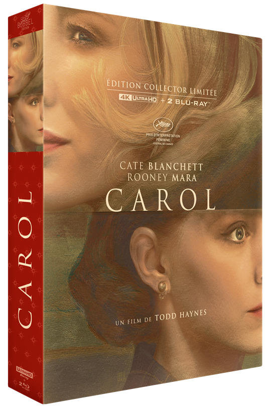 Carol fait l’objet d’une édition particulièrement soignée chez Pop’Bubble Editions, jeune structure qui célèbre ici les dix ans du film de Todd Haynes avec une proposition d’une grande richesse. Deux éditions sont proposées. La première, une édition collector, réunit le film en 4K et en Blu-ray, bénéficiant d’un nouveau master HD remarquable. Elle est accompagnée d’un second Blu-ray regroupant plus de trois heures de suppléments, ainsi que d’un livre de 100 pages, de quatre cartes postales et de l’affiche du film. Une édition limitée Fnac, numérotée à 500 exemplaires, vient compléter cette offre en reprenant l’intégralité du collector, enrichi d’objets exclusifs : le vinyle de la bande originale, un lookbook conçu autour du travail de Haynes, quatre photographies du film et une lettre. Les bonus se distinguent par leur exhaustivité et leur pertinence, abordant l’ensemble des dimensions de l’œuvre à travers les témoignages de ses principaux artisans. Les producteurs : Stephen Woolley (23 min), Elizabeth Karlsen (21 min) et Christine Vachon (7 min) reviennent sur la genèse du projet. La création visuelle est explorée avec la costumière Sandy Powell (20 min) et la maquilleuse Morag Ross (20 min). D’autres modules complètent cet ensemble : un segment consacré au financement du film (9mn), un autre au roman original (6 mn), ainsi que plusieurs pastilles revenant sur les débuts du projet : Le Commencement (13 mn), La rencontre d’Elizabeth et Christine (2 mn), Happy Birthday (3 mn), sans oublier un making of conséquent (17 mn). Enfin, une série d’entretiens vient approfondir la réflexion, avec Todd Haynes (45 min), Cate Blanchett (14 min), Rooney Mara (8 min), Ed Lachman (7 min) et Christine Vachon (6 min). Pour une première édition vidéo, Pop’Bubble Editions signe un véritable coup de maître, alliant exigence éditoriale et générosité des contenus, à la hauteur de l’importance du film. Un must !