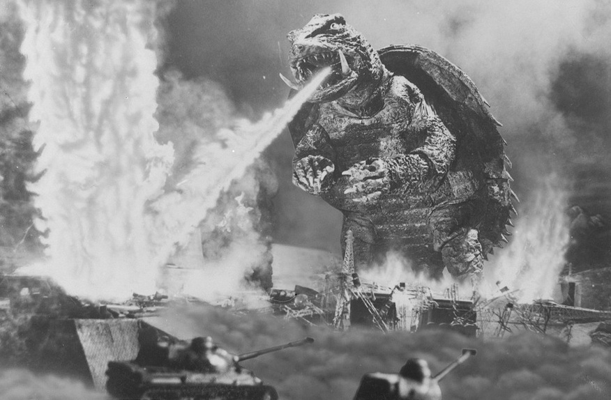 La grande gageure du film réside dans la capacité à donner vie à une tortue géante crédible et expressive. Son design est confié à Masao Yagi, artiste et sculpteur ayant déjà participé à la création de Godzilla. Repéré pour son savoir-faire, Yagi est ensuite contacté par la Daiei afin de contribuer aux effets spéciaux de Tōmei ningen to hae otoko (1957), réalisé par Mitsuo Murayama — une curiosité relatant l’histoire d’un inspecteur de police rendu invisible par un rayon cosmique, qui traque un serial killer réduit à la taille d’une mouche à la suite d’une expérience militaire. Pour Gamera, Yagi s’entoure d’une équipe d’artistes afin de concevoir un monstre particulièrement atypique. Gamera nage, vole, crache du feu, rampe, mais peut également marcher sur deux pattes. Cette polyvalence rend la manipulation des différentes marionnettes et costumes particulièrement complexe, nécessitant plusieurs « acteurs » pour incarner la créature — là où Godzilla repose généralement sur une approche plus unifiée. Malgré ces contraintes techniques, le résultat à l’écran s’avère des plus convaincants, donnant naissance à une créature immédiatement identifiable et dotée d’une physicalité singulière, appelée à devenir l’une des figures majeures du kaijū eiga.