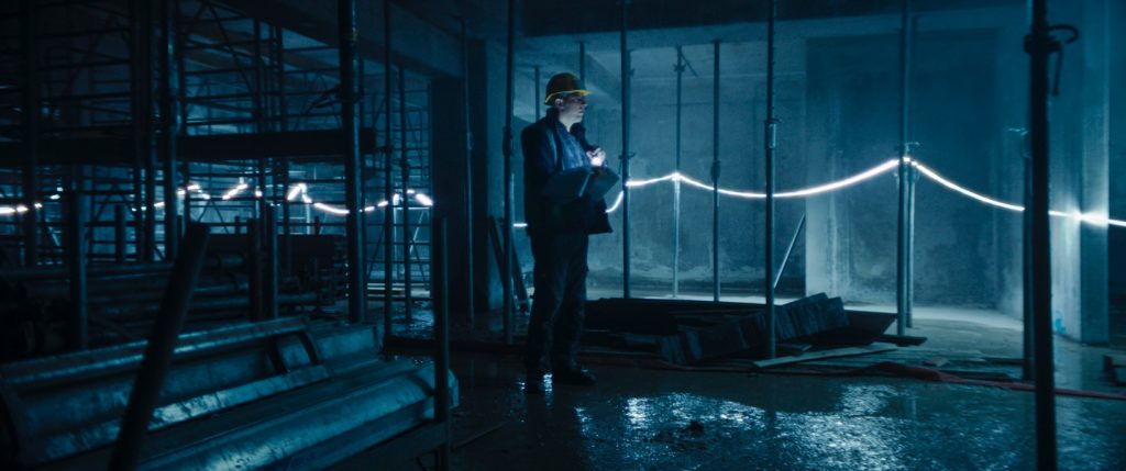 Le film se déroule presque exclusivement la nuit. La nuit est ici le temps du travail « invisible » qui permet à la ville diurne d’exister sans jamais connaitre ceux qui la construisent. Chez Hata, la nuit est un temps suspendu, un temps qui reste hors de l’histoire officielle. Le cinéaste utilise donc le temps nocturne comme temps politique. Conçus entre matérialité et symbolisme par Aurore Casalis et Mathieu Buffler, les décors du film placent l’espace du chantier, avec son béton brut, ses structures inachevées et ses profondeurs obscures, à la fois dans une réalité palpable et dans une abstraction métaphorique. Ce mélange confère au lieu une dimension symbolique qui renforce l’idée d’un monde en perpétuelle construction, non seulement matérielle mais aussi sociale. Véritable dispositif cinématographique, le chantier n’est pas utilisé ici comme simple décor, mais comme appareil idéologique. A l’image de la précarité qui influence nos relations humaines, comme dans un espace disciplinaire, le chantier organise les corps, le temps, les déplacements, les hiérarchies et même les affects.