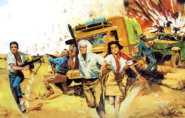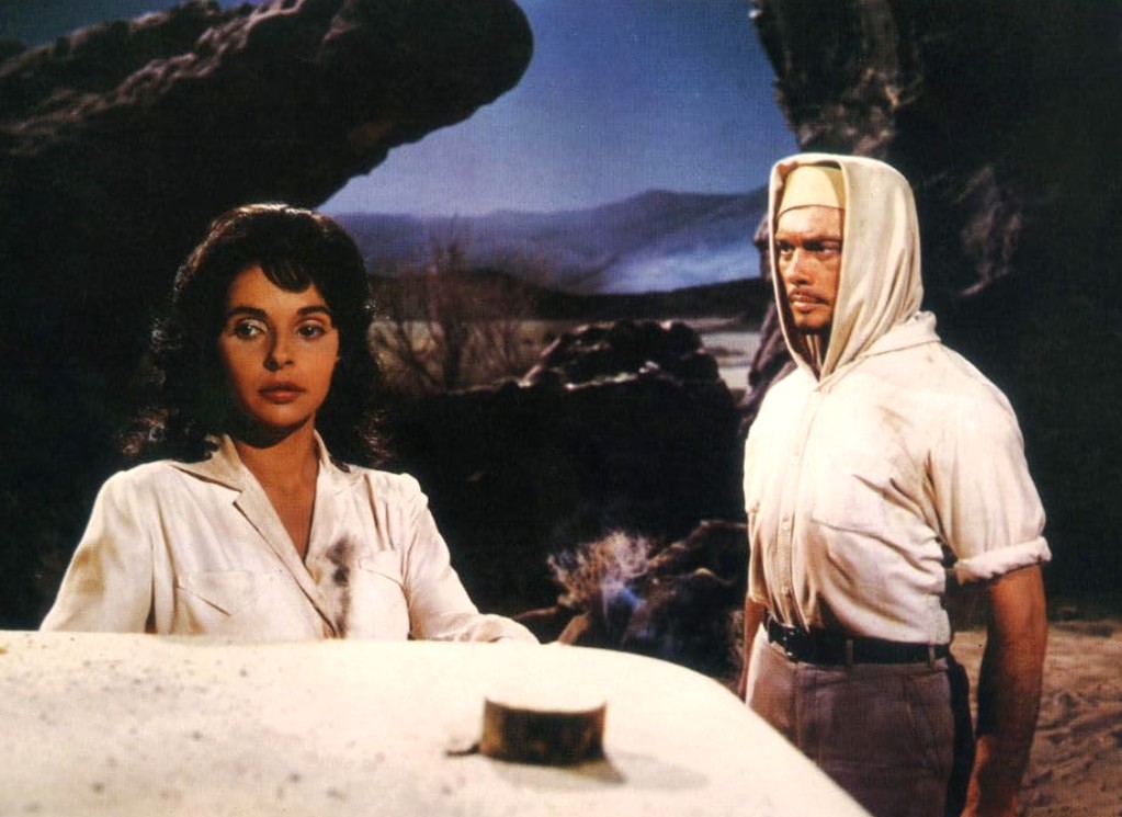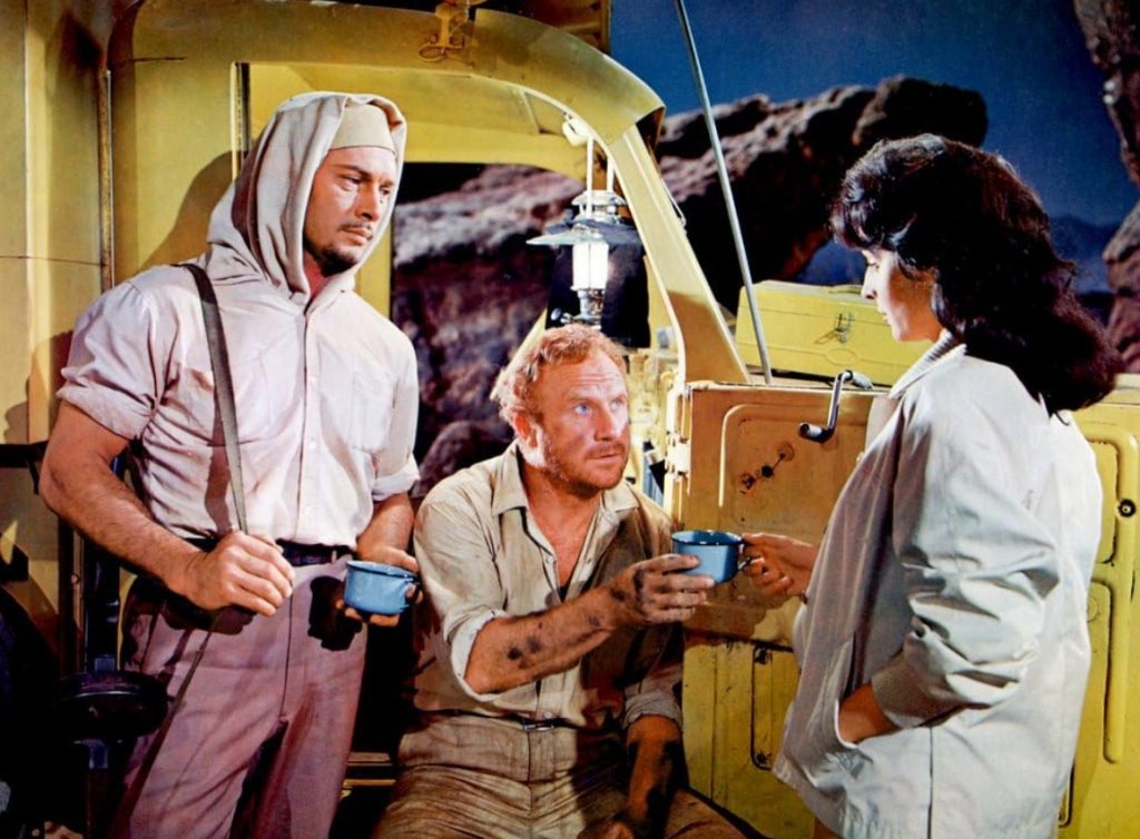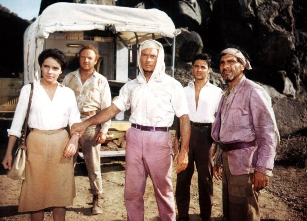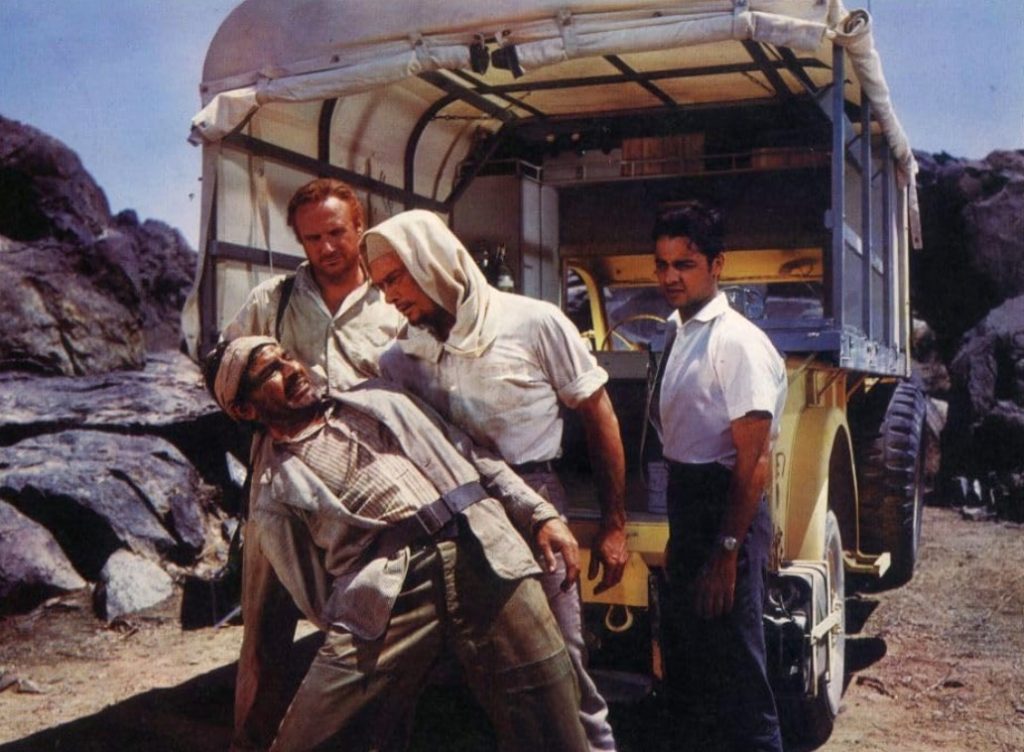 Le scénario de Les Fuyards de Zahrain s’inscrit clairement dans la tradition du grand film d’aventure, et l’on pense notamment au Trésor de la Sierra Madre. Le clin d’œil est assumé : l’escroc américain du groupe se nomme Huston — un hommage à peine voilé à John Huston. Comme dans les modèles du genre, les alliances se font et se défont au gré des circonstances, des intérêts, des trahisons ou des éclairs de solidarité opportunistes. Dans ce microcosme dominé par la rudesse et les tensions viriles, le personnage de Laila (Madlyn Rhue) introduit une touche de sensualité, mais aussi une forme de modernité. Elle est la seule à porter un regard extérieur sur ces hommes, souvent repliés sur eux-mêmes et leurs convictions. L’autre grande référence du film est Le Salaire de la peur, perceptible dans la manière dont Ronald Neame filme le camion-ambulance. Les séquences de passages vertigineux à flanc de montagne ou dans des ravins évoquent directement les scènes d’anthologie du film de Clouzot. Le suspense y est savamment entretenu, et le décor devient un acteur à part entière.