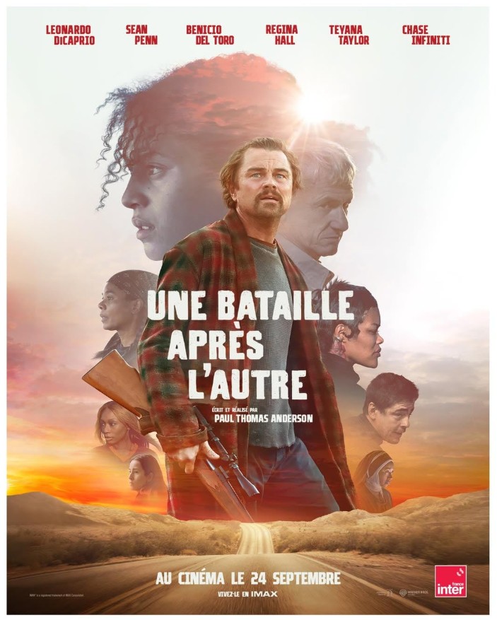 Une Bataille après l’autre (One Battle After Another), un film de Paul Thomas Anderson avec Leonardo DiCaprio, Sean Penn, Benicio Del Toro, Regina Hall, Teyana Taylor, Chase Infiniti, Wood Harris, Alana Haim, Shayna McHayle, Paul Grimstad… Directeur de la photographie : Michael Bauman. Décors : Florencia Martin. Costumes : Colleen Atwood. Montage : Andy Jurgensen. Musique : Jonny Greenwood. Producteurs : Paul Thomas Anderson, Sara Murphy et Adam Somner. Production : Warner Bros. – Ghoulardi Film Company – Domain Entertainment. Distribution (France) : Warner Bros. (Sortie le 24 septembre 2025). États-Unis. 2025. 2h41. Pellicule Kodak Vision. Panavision & VistaVision. Format image : 1.43 : 1 (IMAX et IMAX 70 mm) – 1.50:1 (VistaVision) – 1.85:1. Son : IMAX 6 pistes – Dolby Atmos – Dolby Surround 7.1 – DTS:X – DTS 70 mm – Auro 11.1. Tous Publics avec avertissement.